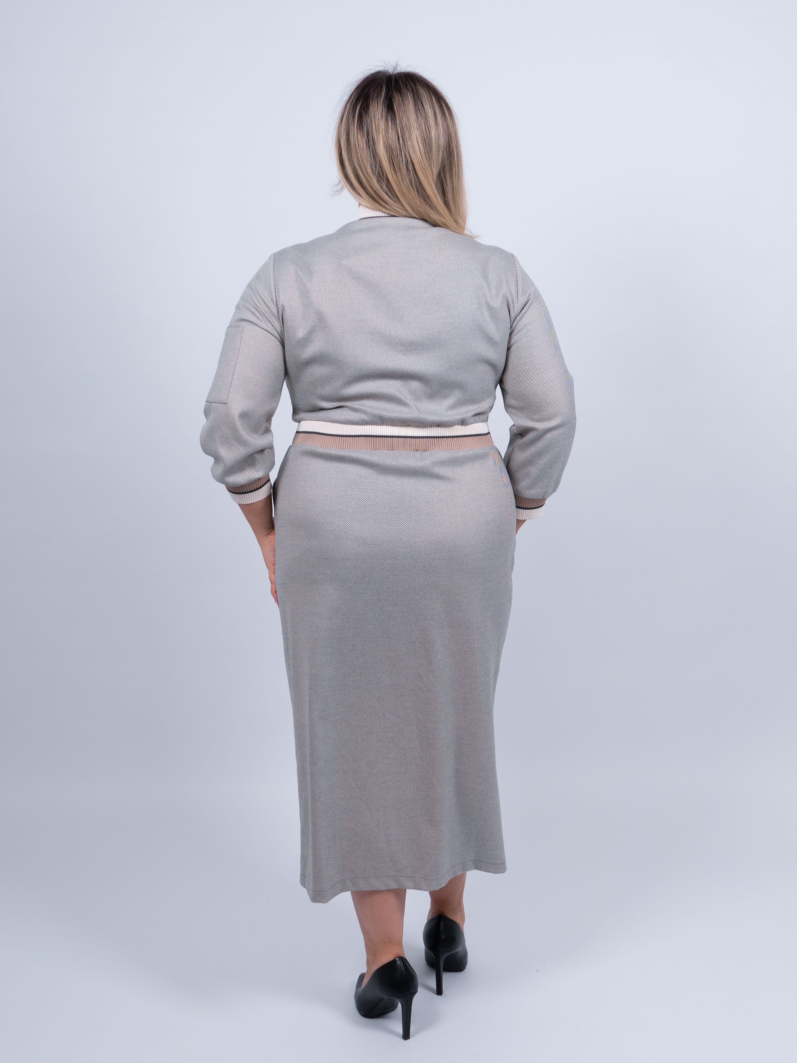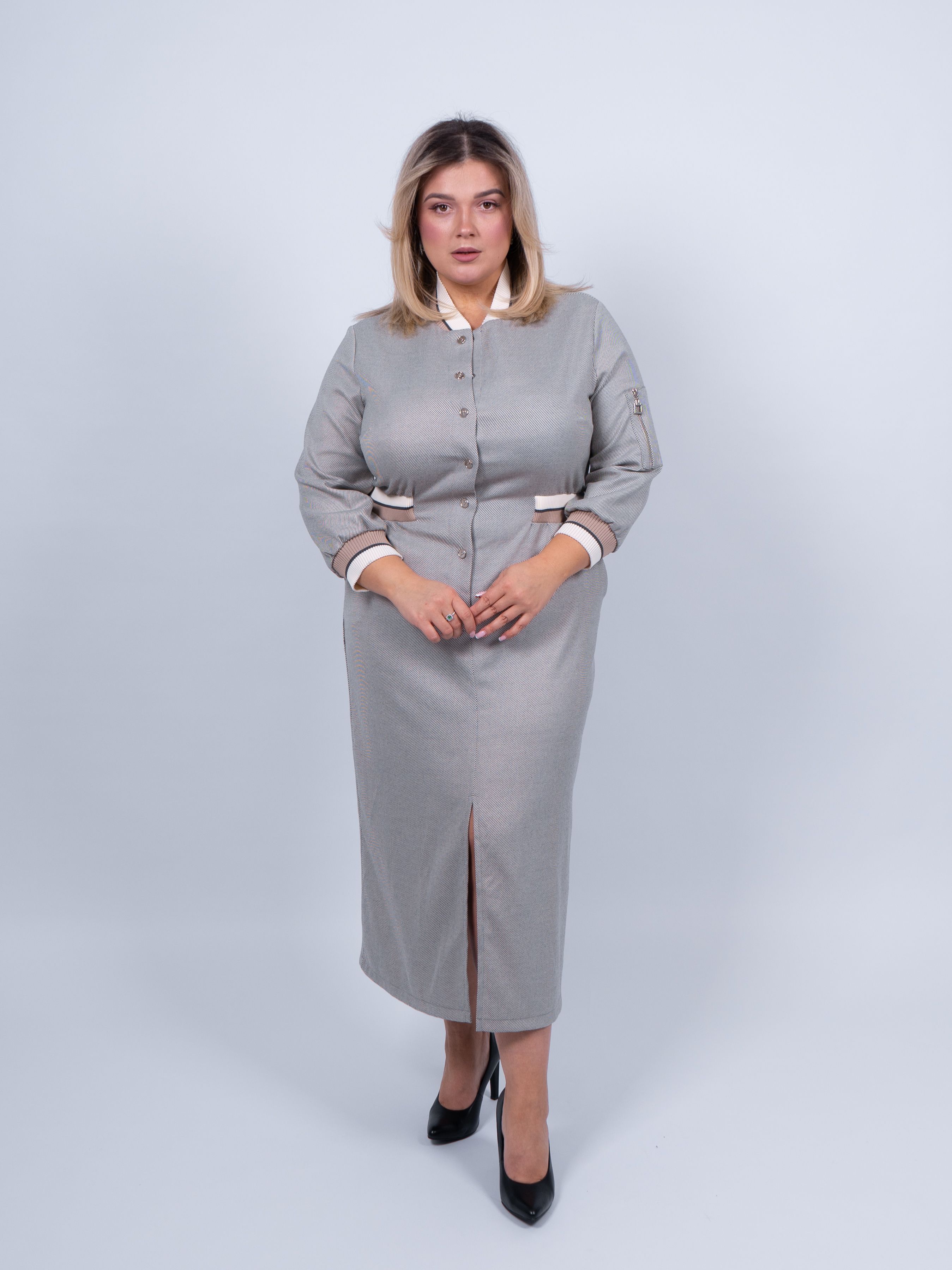 Это элегантное платье серого цвета станет прекрасным дополнением к вашему гардеробу. Оно имеет длину ниже колена, что придает ему изысканность и женственность.