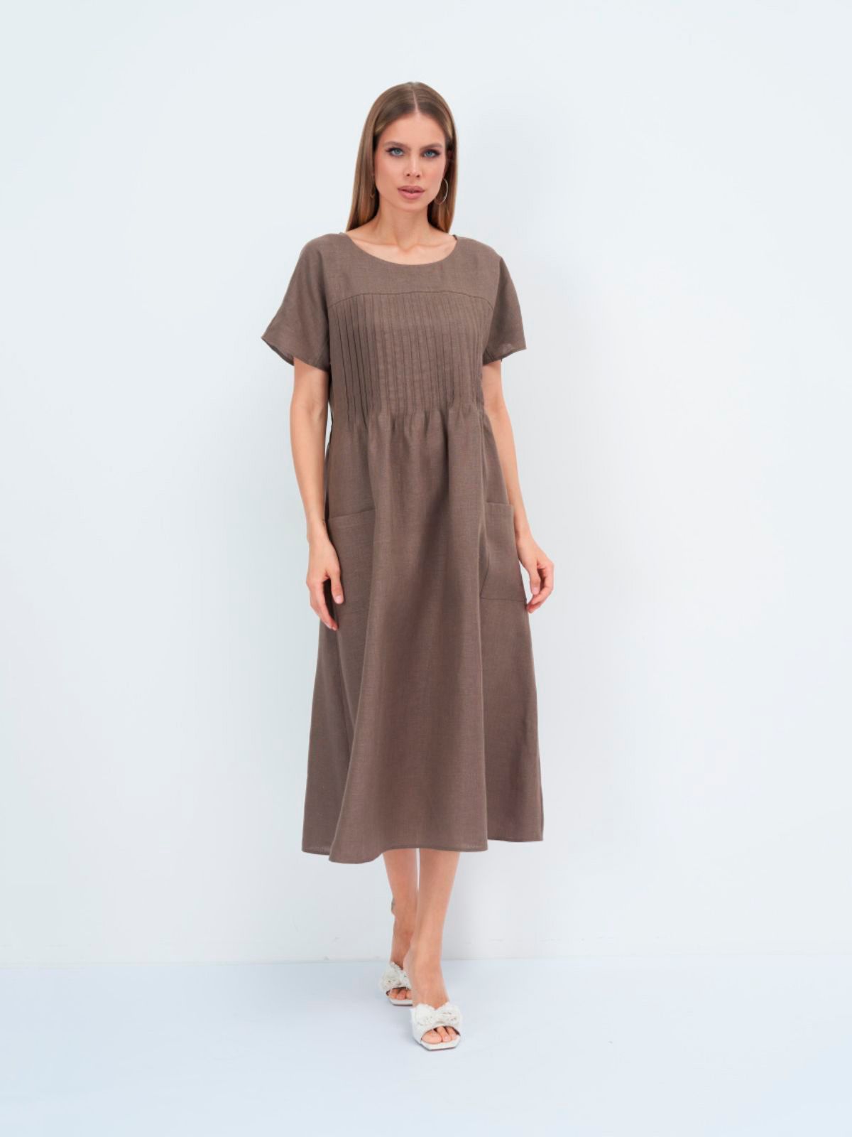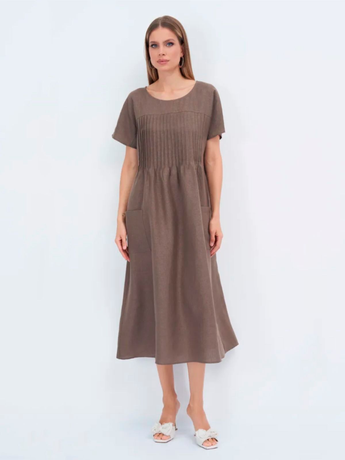 Платье выполнено из белорусского льна, что обеспечивает комфорт и свежесть в летние дни. Материал приятный на ощупь, легкий и хорошо пропускает воздух, что позволяет коже дышать и не перегреваться даже в самые жаркие дни. Женственное, легкое платье на каждый день в сочетании с аксессуарами позволяет создавать комплекты на лето, для работы, для офиса, прогулок, праздников и для отдыха на море, для пляжа.