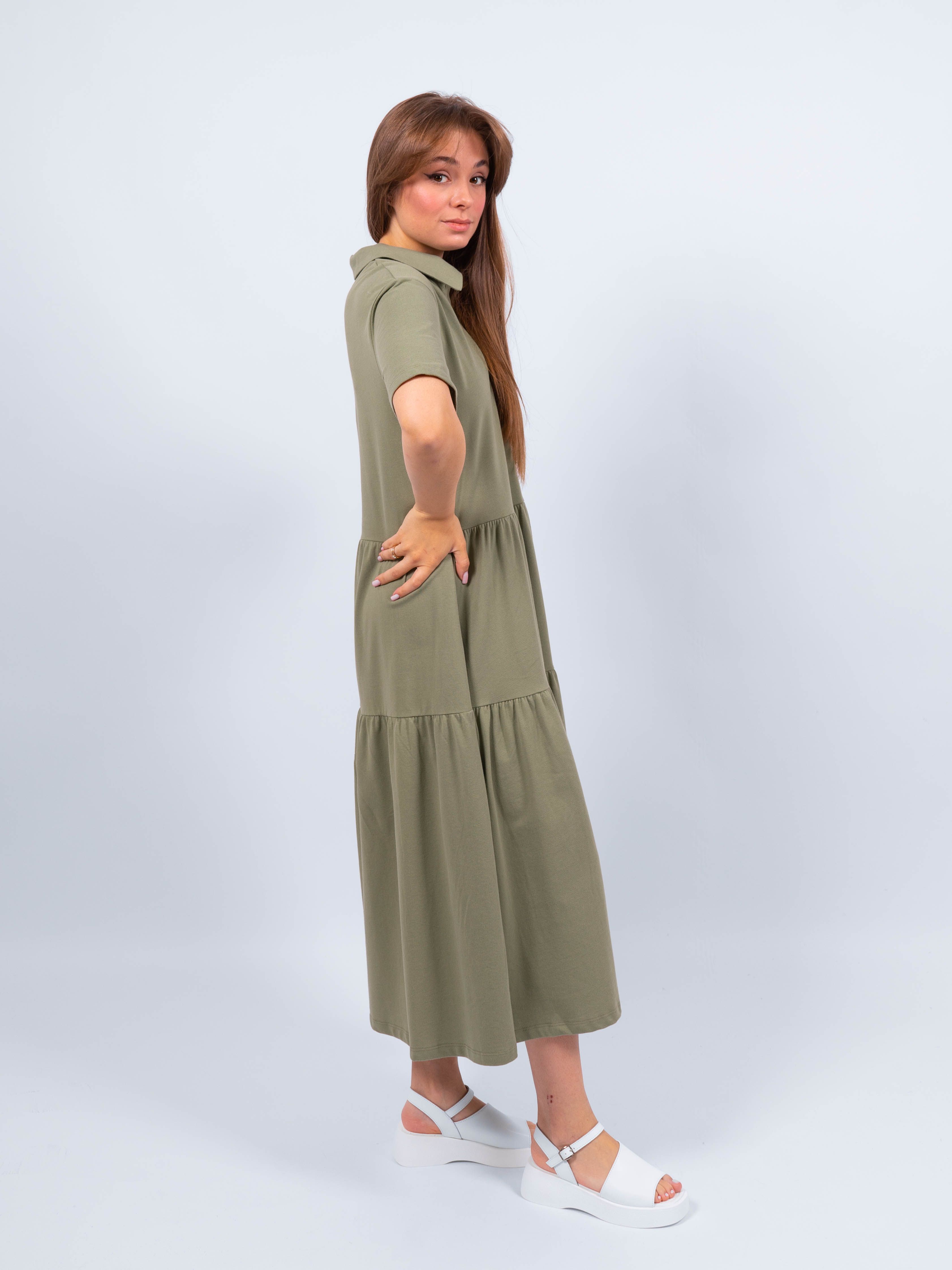 Платье защитного цвета выполнено из хлопка, что обеспечивает комфорт и свежесть в летние дни. Материал приятный на ощупь, легкий и хорошо пропускает воздух, что позволяет коже дышать и не перегреваться даже в самые жаркие дни. Женственное, легкое платье на каждый день в сочетании с аксессуарами позволяет создавать комплекты на лето, для работы, для офиса, прогулок, праздников и для отдыха на море, для пляжа.