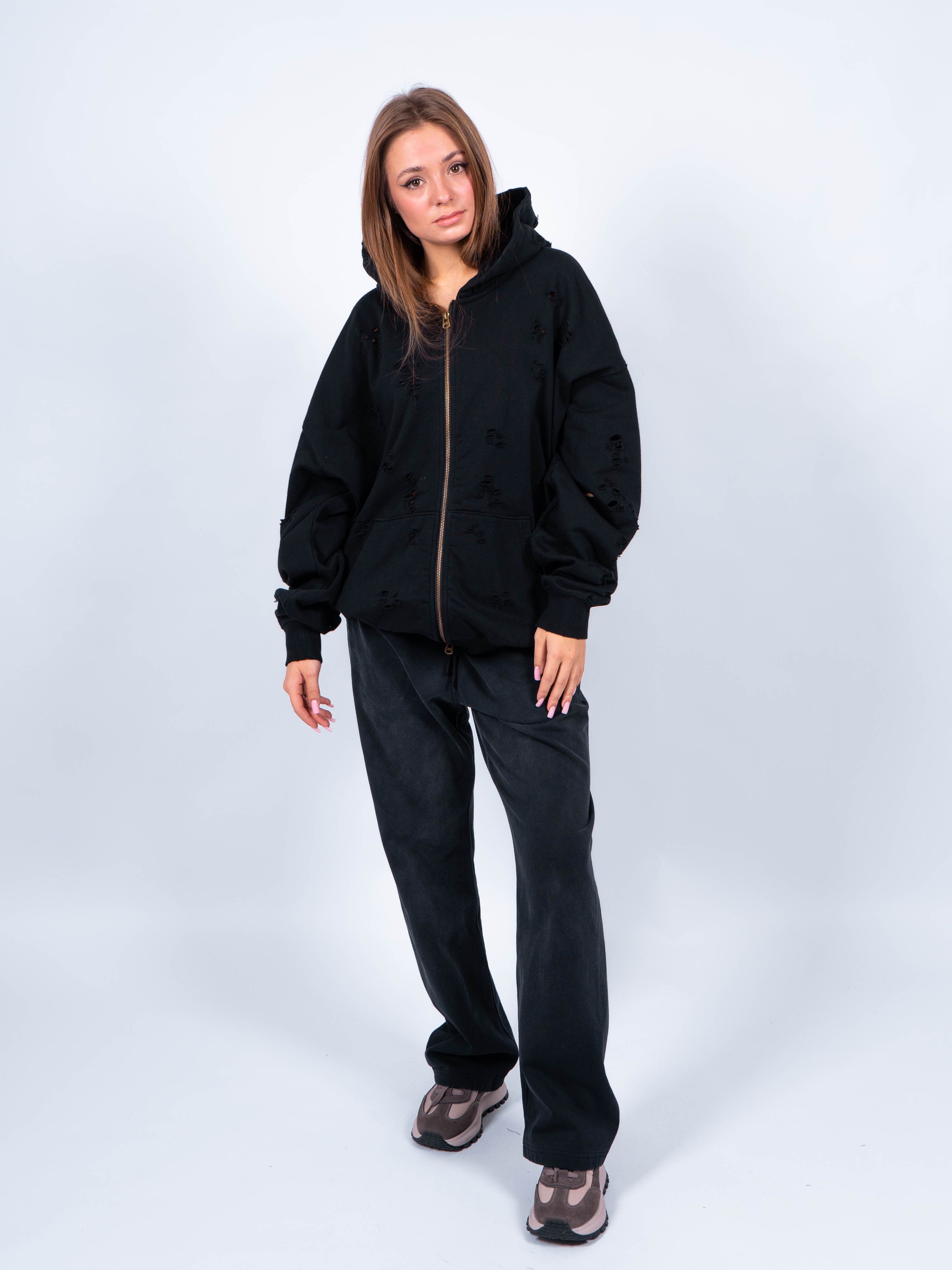 Укороченное худи на молнии эффектно смотрится с любыми джинсами: укороченными и широкими, клеш и бойфрендами. Практичная, удобная кофта с капюшоном, вместительными карманами не потеряет изначальный вид после стирки, не линяет, не вытягивается.