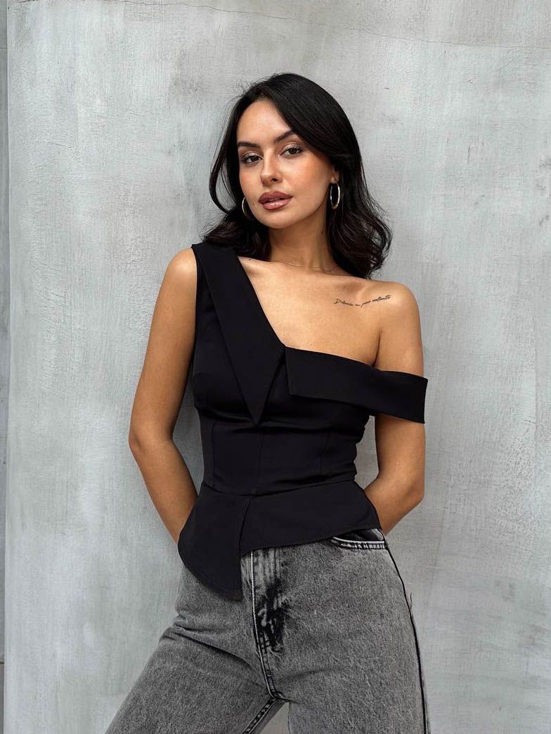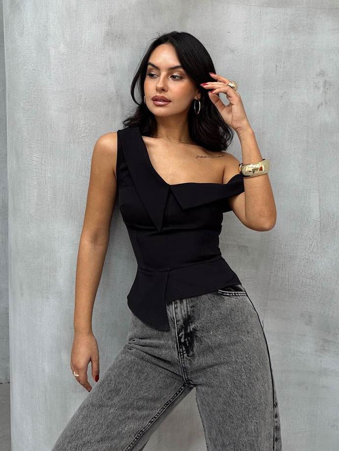 Летняя кофта-корсет без рукавов на одно плечо черного цвета, для стильных дам, представляет собой утягивающее изделее на молнии сзади. Топ женский отлично подойдет для походав ресторан или для повседневного лука. Универсальный элемент гардероба подойдет для вечеринок и других мероприятий в стиле Party style. В нем Вы точно не останетесь незамеченной! Невероятно стильный корсет с декольте, с имитацией спущенного плеча, с застежкой молния по спинке. Легко сочетать с другими предметами гардероба, юбкой, брюками, джинсами.