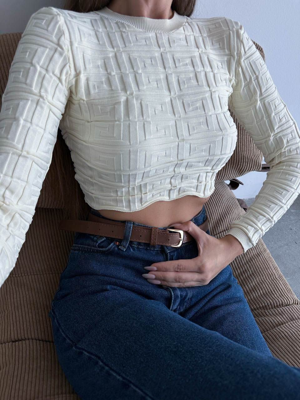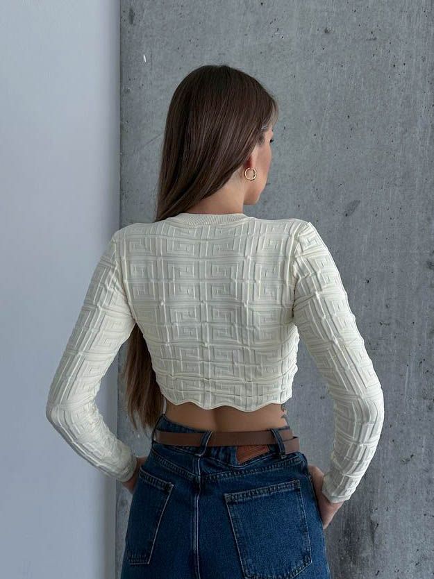 Кофта женская, укороченная, прилегающего силуэта понравится всем модницам. Трикотажный лонгслив имеет фигурный край , что придает особую изюминку данной модели. Универсальный элемент гардероба подойдет для вечеринок и других мероприятий в стиле Party style.